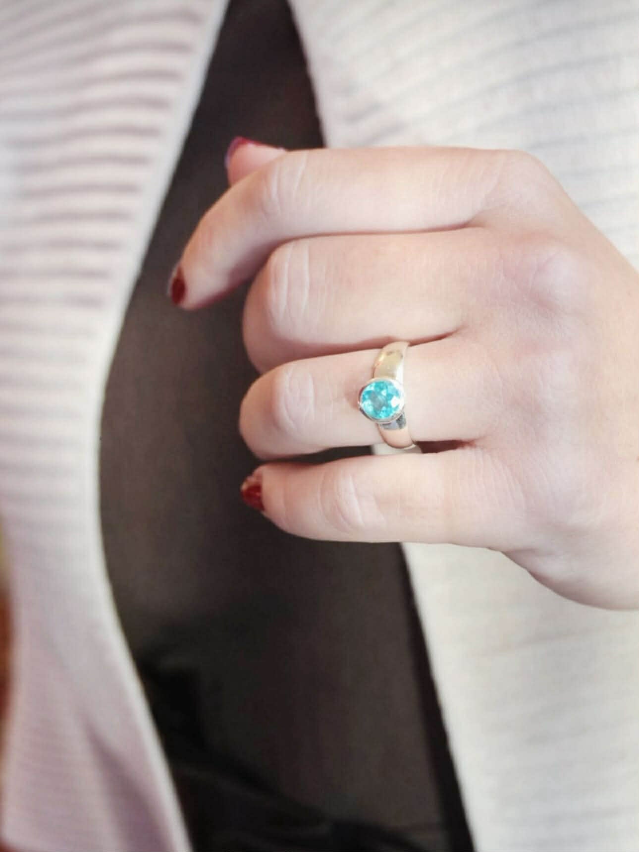 Un gioiello dall’equilibrio raffinato e contemporaneo: questo anello in argento con al centro un'apatite azzurra. La pietra, incastonata con cura nel castone, attira la luce e dona all’anello un carattere vivace ma sofisticato.