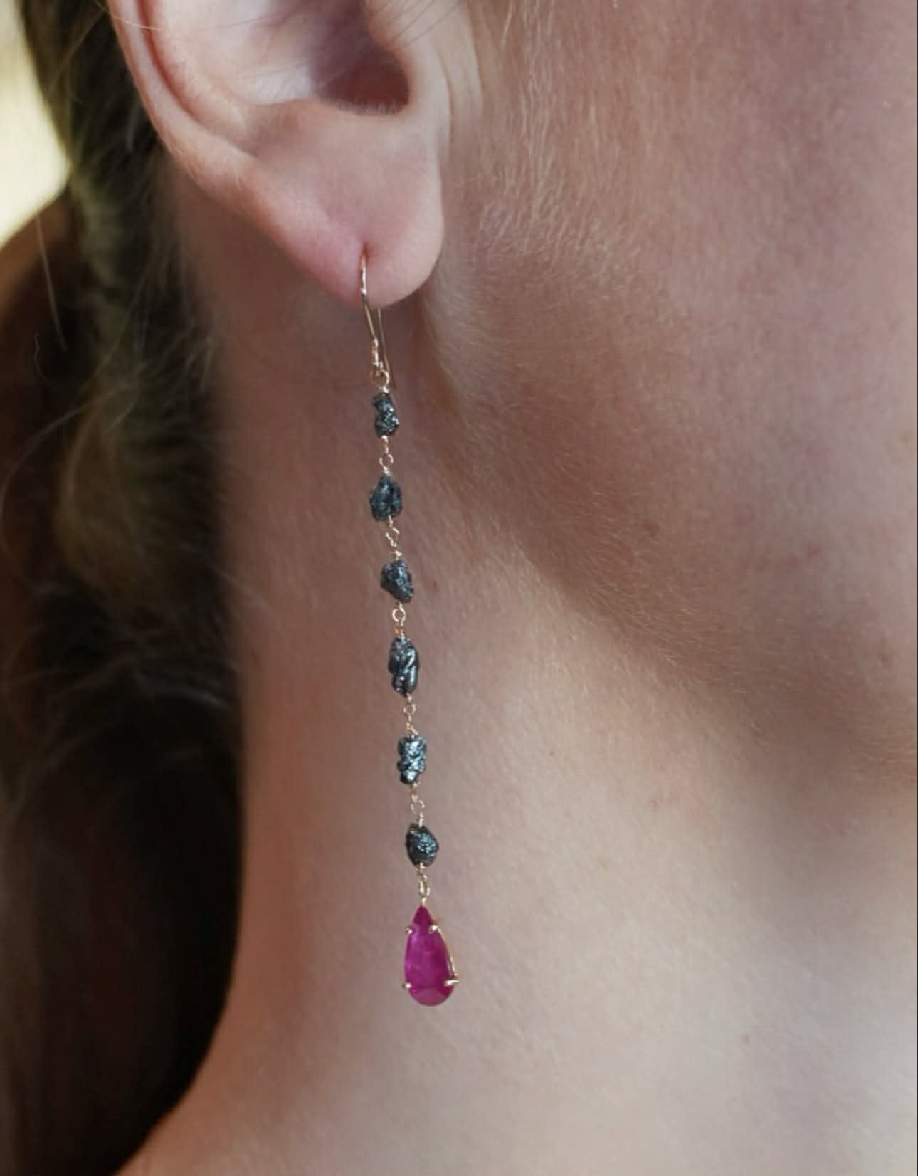 Aggiungi un tocco di eleganza contemporanea alla tua collezione con questi esclusivi orecchini pendenti in oro rosa 18 carati, impreziositi da splendidi rubini a goccia e da una raffinata selezione di diamanti grezzi.